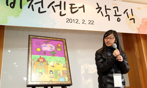 비전센터 착공식에 참석한 어린이가 비전센터에 바라는 소망을 그림으로 보여주고 있다. /KT 홍보실 제공