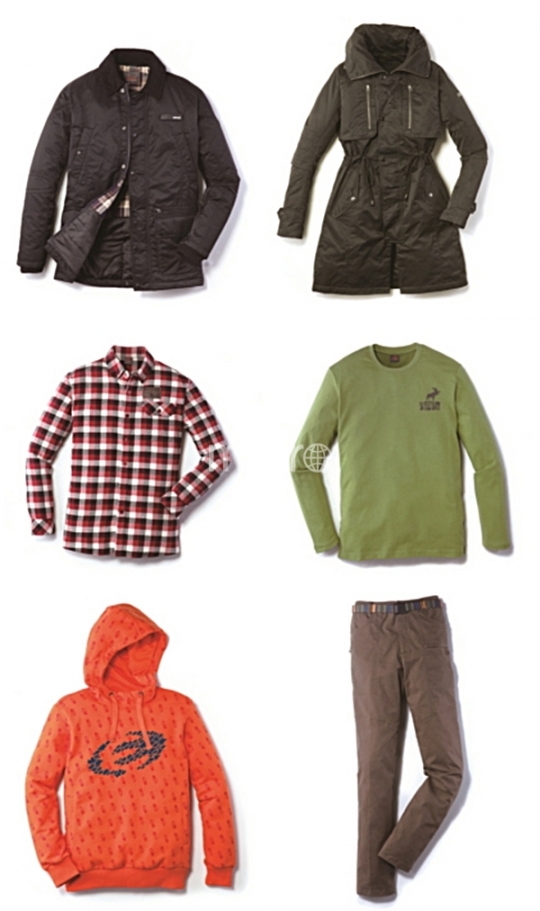 사진 상단 완쪽부터 플래그쉽 재킷, 파라델 재킷, 켈레보른 체크셔츠, 아웬 라운드티셔츠, 사우론 후드티셔츠, 메리 팬츠.