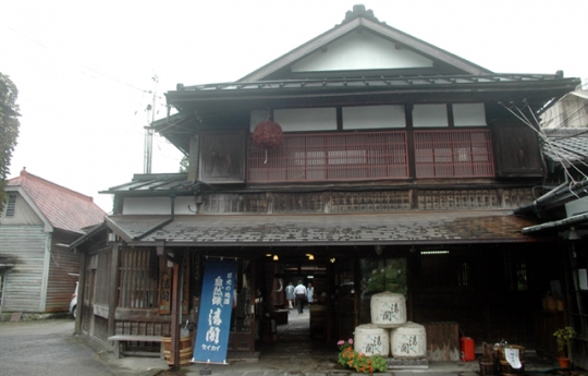 미야자키 하야오의 애미메이션에서 봤음직한 모습의 술창고 '와타나베 사헤이'. 2층에 걸려있는 둥그런 모양의 표식은 지금 술을 만들고 있음을 나타낸다.