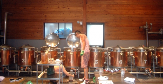 기우치 주조에서 손님들이 맥주를 만들고 있다.
