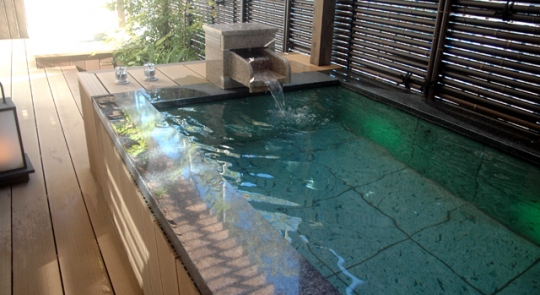 온천에서 바로 끌어올린 온천물이 흐르는 호텔 객식내의 개인온천. 뒤로 족욕탕이 보인다.