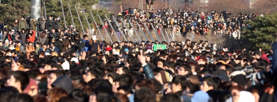 크리스마스 이브인 24일 오후 서울 여의도 공원에서 시민들이 소셜이벤트 '솔로대첩'을 바라보고 있다.