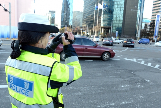 서울지방경찰청이 3월 18일부터 서울지역 3500여개 교차로에서 ‘꼬리물기’ 영상 촬영 방식으로 집중 단속에 나선다고 28일 밝혔다. 사진은 서울 중구 을지로 2가 교차로에서 경찰이 ‘꼬리물기’를 단속하는 모습.