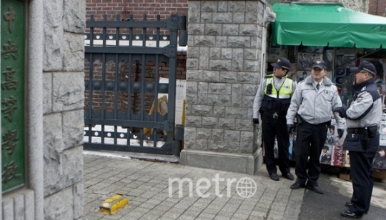 경찰관 아저씨들이 학교 정문 앞에 보초를 서면서 혹시 모를 만약의 사태를 대비하고 있습니다.