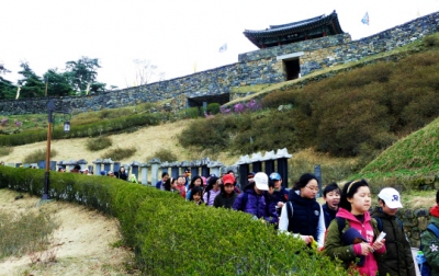 ▲ 공주의 유명관광지인 공주산성에서 초등학생들이 단체견학을 하고 있다. 산성시장은 공주산성 입구 바로 맞은편에 위치한다.