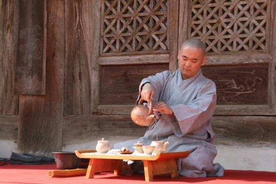▲ 지난해 열린 마곡사 신록축제에서 한 스님이 전통 다도를 시연하고 있다. /공주시청 제공.