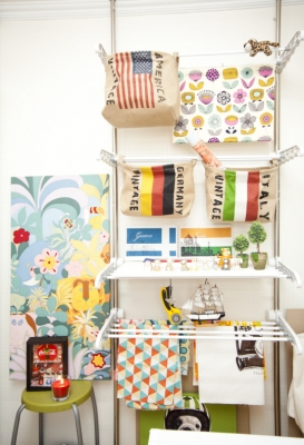 조립형 빨래·식기 건조대에 디자인 에코백을 걸면 주머니형 선반이 된다. 물건이 보이지 않아 깔끔하고 가방을 걸고 빼기 쉬워 활용도가 높다. 키높이와 맞지 않는 층에는 판넬을 깔고 장난감이나 미니 화분으로 포인트를 주면 된다.