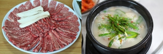 ▲ 황토한우 갈비살(사진 왼쪽)과 돼지국밥.