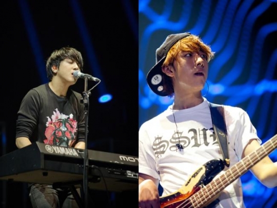 건반을 치며 노래하는 리더 정용화(왼쪽)와 베이스 이정신.