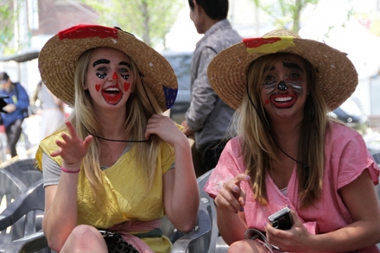 ▲ 작년 열린 품바축제에서 참가한 외국인들이 품바체험을 하고 활짝 웃고 있다.