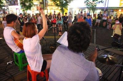 어둠이 내려앉은 오후 8시30분. 재즈 향기 물씬 나는 강렬한 보컬이 가벼운 여름 바람에 실려 날아가며 공연이 시작됐다. 이들은 싱글 타이틀 '이별… 사랑을 듣다'와 '난 남자가 있는데' 등 자작곡과 개사한 곡들을 펼쳐놨다. '희망사항' '골목길'(신촌블루스) 등 7080 가요는 리듬과 가사도 좋지만 오가는 4050세대의 발길을 잡을 주요한 무기다.