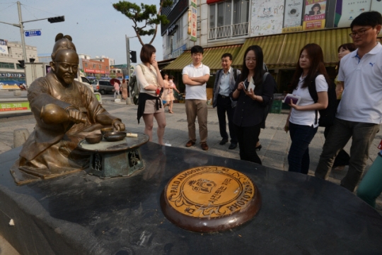 ▲ 팔달문시장 유상박물관 앞에 위치한 '불취무귀' 동상. 당시 극심한 가뭄으로 배고픔에 시달리던 백성들을 걱정하는 정조의 소박한 주안상을 재현했다.