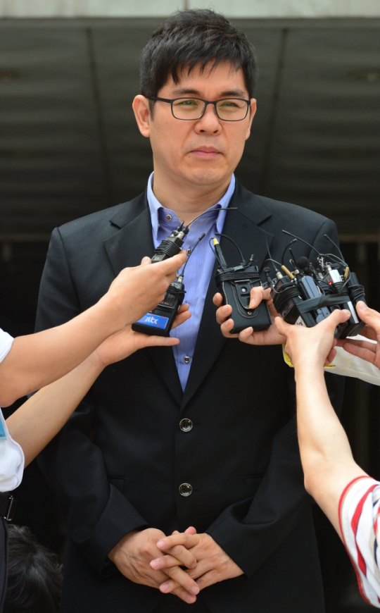 ▲ 상습 도박 혐의로 징역 8월을 선고받은 김용만이 취재진의 질문에 답하고 있다./뉴시스