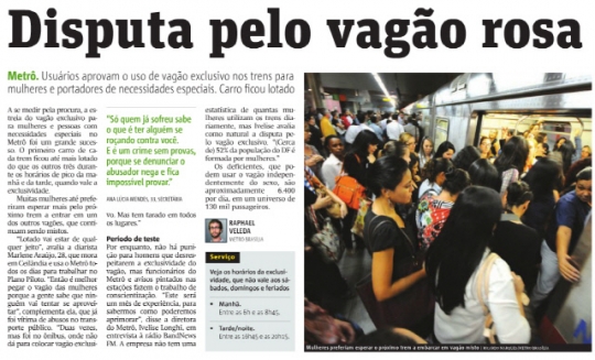 여성뿐만 아니라 장애인도 성별에 상관 없이 특별 칸을 이용할 수 있다. 이벨리지에 따르면 매일 지하철을 이용하는 여성승객들의 수치는 아직 파악하지 못했으나 브라질리아 인구의 약 52%가 여성이라고 밝혔다. 또한 장애인 승객 수는 전체 승객 13만 명 중 6400명이다.