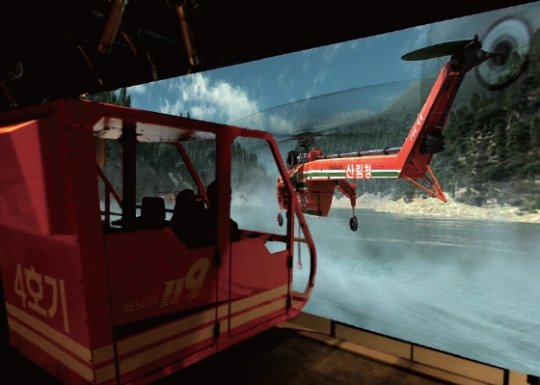 ▲ 365세이프타운 안전체험관 산불진화체험 참가자들이 헬기 시뮬레이터에 탑승해 실감나는 산불진화체험을 하고 있다.