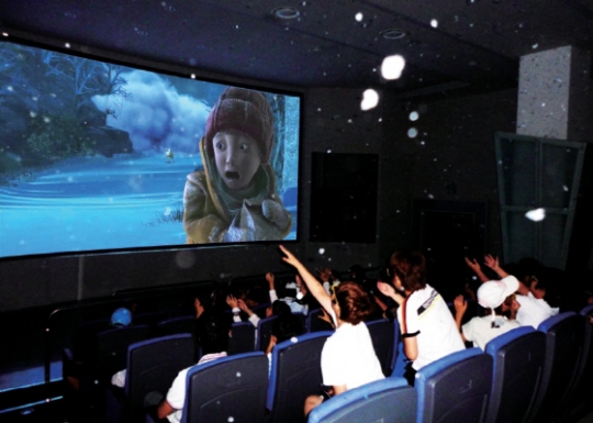 ▲ 365세이프타운 안전체험관 설해체험 참가자들이 3D 영상속 눈송이를 만지려 손을 흔들고 있다.