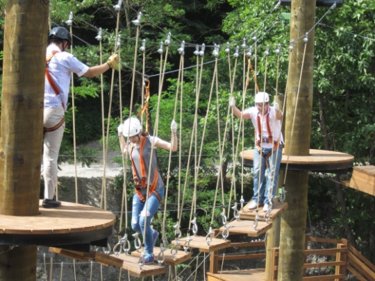 ▲ 트리트랙 챌린지에 참가한 도전자 2명이 구름다리를 건너고 있다. 모든 체험은 안전장치가 구비된 상태에서 진행된다.