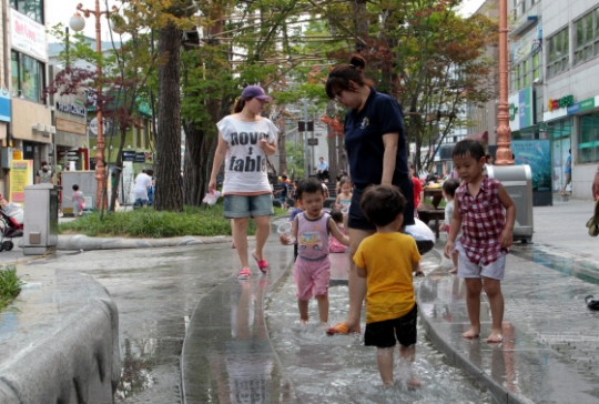 ▲ 축제가 열리는 의정부 행복로 행복천에서 아이들이 엄마와 함께 즐거운 한때를 보내고 있다.