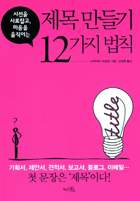 기획서·제안서·견적서·블로그·이메일에는 제목이 필요하고 중요하다. 여기에서 제목은 문서의 헤드 카피고, 핵심 콘셉트다. 강력하고 명확한 제목이 정해지면 문서의 90퍼센트는 이미 완성된 것이나 마찬가지라고 할 수 있다. 마케팅 전문가인 저자는 "단번에 마음을 움직이는 제목이 비즈니스를 승리로 이끈다"며 대박 제목을 만드는 12가지 법칙을 공개한다.