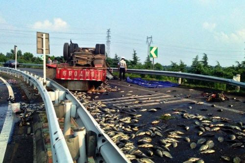 中 활어운반 화물차 전복…가마솥 더위로 '도로 위 생선구이'