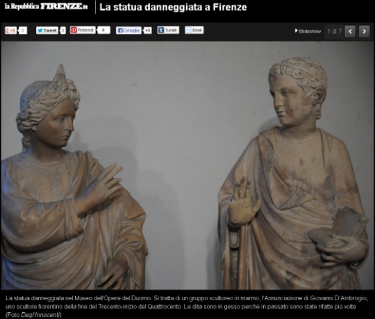 5일(현지 시간) 이탈리아 피렌체 두오모 박물관에서 한 미국인 관광객이 부주의로 석고상의 손가락 부분을 파손하는 사고가 일어났다고 현지 일간지 라 레뿌블리카가 보도했다.
