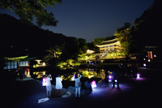 연경당으로 넘어가는 길은 키 큰 소나무가 달빛을 숨기자 관람객이 든 청사초롱이 길을 안내한다. 어둠 속에 총총히 떠가는 청사초롱 불빛이 창덕궁과 어우러지며 또 하나의 아름다운 그림을 만들어낸다.