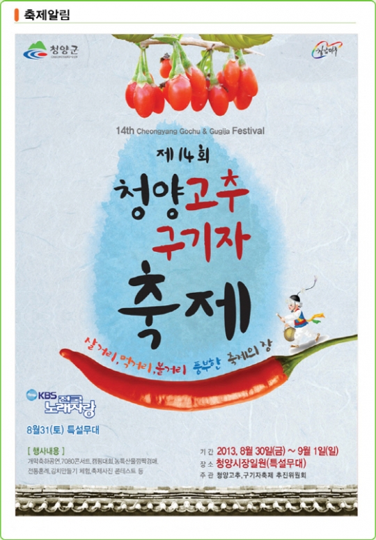 축제는 '충남의 알프스에서 열리는 힐링 체험'이라는 주제에 맞게 보고, 맛보고, 즐길 수 있는 '오감 만족 체험형 축제'로 마련된다. '고추 장인을 찾아라' '구기자주 마시고 고추 빨리 먹기' '청양매운 음식관' 등 다채로운 축제 프로그램이 펼쳐지고 골프, 테니스, 게이트볼 등 각종 체육 행사도 함께 개최된다.