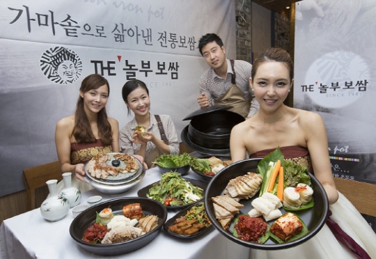 놀부보쌈이 26년 만의 브랜드 리뉴얼을 통해 '더(THE)놀부보쌈' 종로타워 직영 1호점을 오픈했다. 지난 27일 서울 종로구 종로타워에서 열린 '더(THE)놀부보쌈' 브랜드 론칭 기념 행사에서 모델들이 더(THE)놀부보쌈의 대표 메뉴인 가마솥 보쌈을 선보이고 있다. 더(THE)놀부보쌈은 세련된 매장 분위기와 다양한 메뉴, 합리적인 가격으로 기존 보쌈 전문점과 차별화된 맛과 서비스를 제공한다.