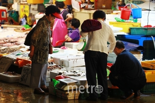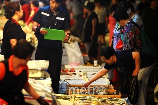 노량진 수신시장을 찾은 시민들이 생선을 구입하기 위해 살펴보고 있다.