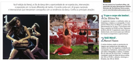 1998년부터 시작된 산투스 댄스 비엔날레에서 선보이는 현대 무용 퍼포먼스는 인간 내면의 잠재된 불안감을 표현하는 것이 특징. 지난 1~2월의 등록 기간 동안 브라질 16개 주와 15개 국가에서 총 446그룹이 참가를 신청했으며 28개의 댄스 팀이 이번 비엔날레에 참여한다.