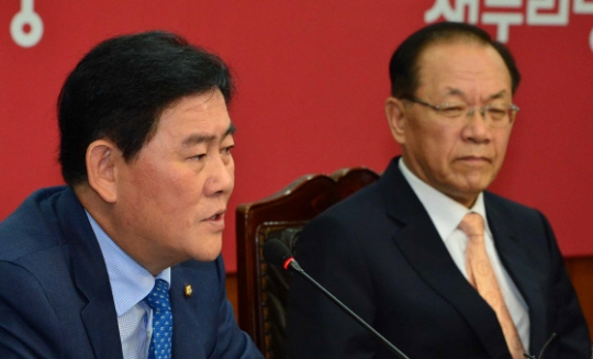 ▲ 새누리당 황우여(왼쪽) 대표가 최경환 원내내표의 발언을 듣고 있다./뉴시스
