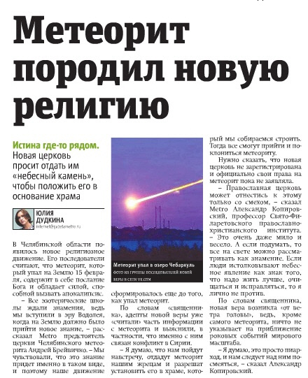 이른바 '운석교'신도들은 지난 2월 첼랴빈스크주 체바르쿨 호수에 운석우(隕石雨)가 내릴 당시 떨어진 운석을 신줏단지처럼 모시고 있다.