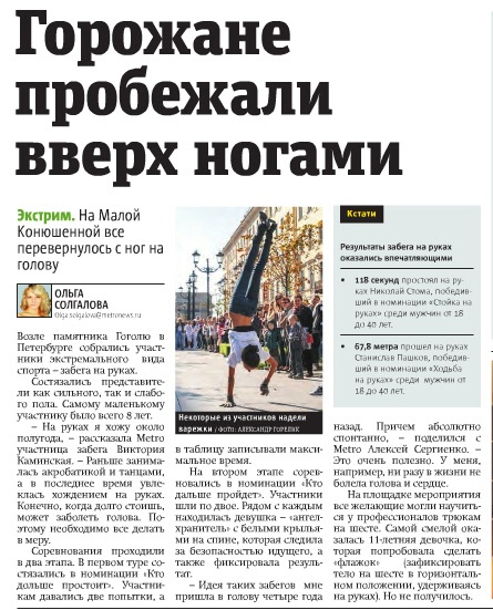 이번 대회의 물구나무 오래서기 챔피언은 니콜라이 스토마(18~40세 남성부문)로 118초의 기록을 세웠다. 또 물구나무 서서 멀리 가기 챔피언은 무려 67.8m의 기록을 세운 스탄슬라프 파쉬코프가 차지했다.