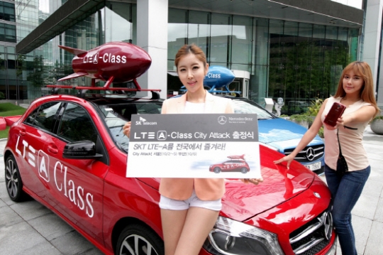▲ SK텔레콤과 메르세데스-벤츠 코리아는 30일 SK텔레콤 을지로 본사 앞에서 A-Class 차량을 전시하며 서울과 부산을 누비는 체험 행사 진행을 위한 출정식을 가졌다. /SKT