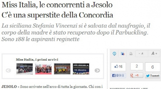 시칠리아 출신의 참가자 스테파니아 빈첸찌(18세)는 "돌아가신 어머니와의 꿈을 이루기 위해 참가했다"고 말했다. 빈첸지의 모친인 마리아 그라찌아는 지난해 1월 질리오 섬에서 발생한 코스타 콩코르디아호 유람선 전복 사고로 사망한 것으로 알려졌다.