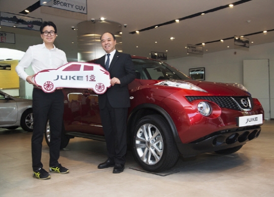 ▲ 한국닛산 타케히코 키쿠치 대표이사와 쥬크 1호 구매자 김중엽씨(왼쪽)에게 전달식을 갖고 있다. /한국닛산