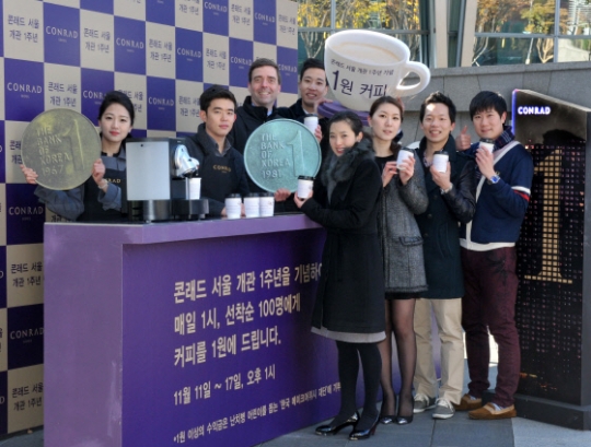 콘래드 서울은 개관 1주년을 기념해 10일 오전 서울 영등포구 콘래드 서울 호텔 앞 광장에서 1원 커피를 선보였다. 호텔 측은 11일부터 17일까지 1주일간 매일 오후 1시에 선착순 100명에게 커피를 1원 제고한다.