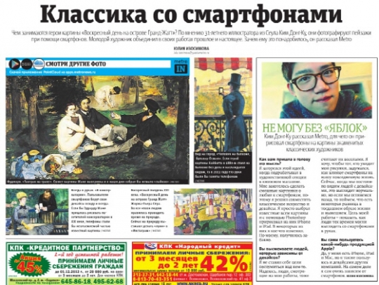 최근 유명 화가의 그림을 재해석해 과거와 현재를 잇는 새로운 예술품으로 재탄생 시키는 김씨의 작품들이 러시아에서 화제다. 그는 특히 스마트폰과 랩톱(노트북)을 명화속에 그려 넣어 눈길을 끌고 있다.