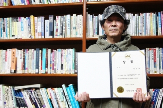 김인수 씨가 대상을 받은 상장을 보여주며 행복한 미소를 짓고 있다. /손진영 기자