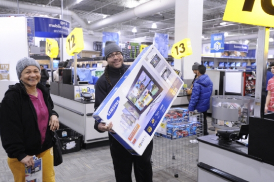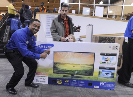 지난 28일(현지시간) 미국 최대 쇼핑 시즌인 블랙프라이데이를 맞아 뉴욕 '웨스트 나이액(West Nyack)'에 위치한 베스트바이 매장에서 고객들이 삼성전자 TV를 구매하고 있다.