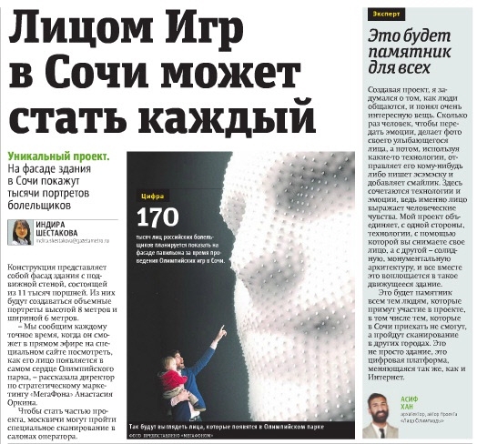 이번 프로젝트를 진행하고 있는 '메가폰'사의 전략 마케팅 부장 아나스타샤 오르키나는 "올림픽의 얼굴들을 위해 높이 8m, 폭 6m의 대형 특수 벽면이 설치됐고 이미 한쪽 벽면이 러시아 올림픽 팬들의 얼굴로 채워졌다"며 "올림픽의 얼굴들 벽이 완성되면 모두 1만 7000명의 얼굴이 새겨질 것"이라고 밝혔다.