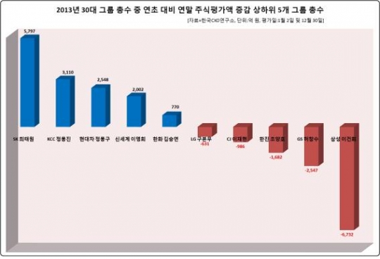 기업분석업체인 한국CXO연구소(소장 오일선)는 '2013년 30대 그룹 총수의 연초 대비 연말 주식평가액 분석 현황 보고서'에서 이 같이 밝혔다. 30대 그룹은 작년 연초 기준 총수가 있는 기업집단을 기준으로 했고 보유 주식은 금융감독원에 보고된 자료를, 주가는 해당일 종가 기준이다. 조사 결과 지난 해 30대 그룹 총수의 주식평가액은 32조6735억 원이었는데 연말에는 33조1892억 원으로 5157억 원 증가했다.