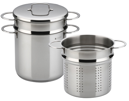 독일 프리미엄 주방용품 브랜드 WMF의 미니 파스타 찜기는 채반 형태의 인서트 냄비가 포함된 파스타 전용 찜기다. 찜기 위에 이중으로 얹혀진 인서트 냄비는 작은 구멍이 뚫려있어 양 손잡이를 잡고 들어올리기만 하면 물에서 파스타만 걸러낼 수 있어 사용하기 편리하다. WMF 고유의 크로마간 소재를 이용했으며 크기가 다른 두개의 냄비를 겹쳐놓은 듯한 디자인도 인상적이다.