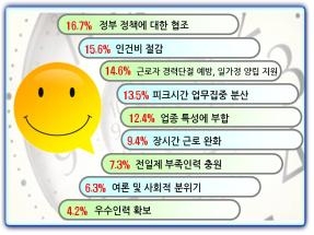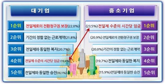 이는 기업 규모별로 차이를 보여 대기업의 경우 '전일제 전환청구권'을, 중소기업은 '전일제 수준의 시간당 임금 지급'을 각각 1순위로 지목했다.