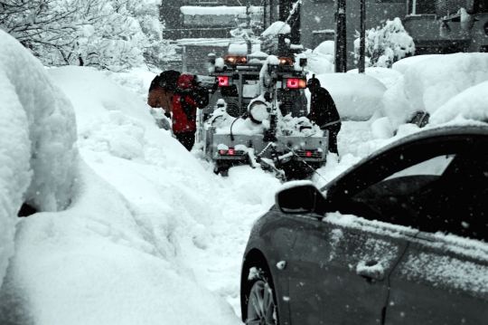 삼성화재 긴급출동 직원이 강원도 강릉시 입암동 한 아파트 단지 도로에서 사람 키 만큼 쌓인 눈에 파묻혀 운행이 어려운 차량 견인 작업을 하고 있다. /삼성 제공