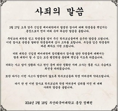 정해린 부산외국어대 총장 사과문 /부산외대 홈페이지