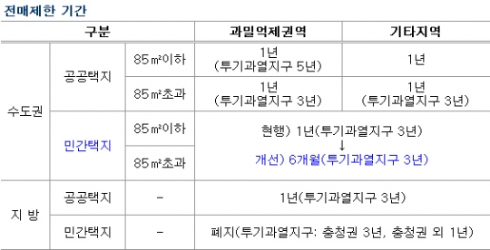 현재 수도권 공공택지의 경우 면적과 권역에 따라 1~5년간, 민간택지는 1~3년간 전매가 제한된다. 지방은 공공택지가 1년, 민간택지는 전매제한이 폐지됐다. 현재 투기과열지구로 지정된 곳이 없어 전매제한 기간은 1년인 셈이다.