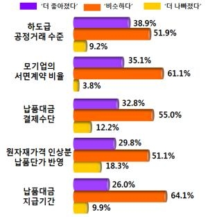 1차 협력사는 ▲모기업의 서면계약 비율 ▲납품대금 결제수단 ▲원자재가격 인상분 납품단가 반영 ▲납품대금 지급기간이 1년 전보다 '더 좋아졌다'는 응답이 각각 62.1%, 64.5%, 44.6%, 52.6%였다.