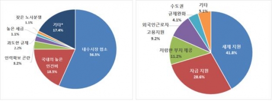 한국으로 복귀를 고려하지 않는 이유로, 국내 내수시장 협소(56.5%)와 높은 인건비(18.5%) 등을 지목했다. 해외 진출기업이 한국으로의 U-턴을 결정하는데 가장 큰 영향을 줄 것으로 생각되는 정부 지원제도로 세제 지원(41.8%), 자금 지원(28.6%), 저렴한 부지 제공(11.2%), 외국인근로자 고용지원(9.2%) 순으로 제시됐다.