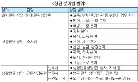 상담센터는 민원 처리를 위한 조사관 상담 뿐만 아니라 변호사·법무사·공인노무사 등 전문가 상담을 무료로 제공하고 있으며 상담·안내 건 수는 지난해만 총 2만6311건에 달한다.